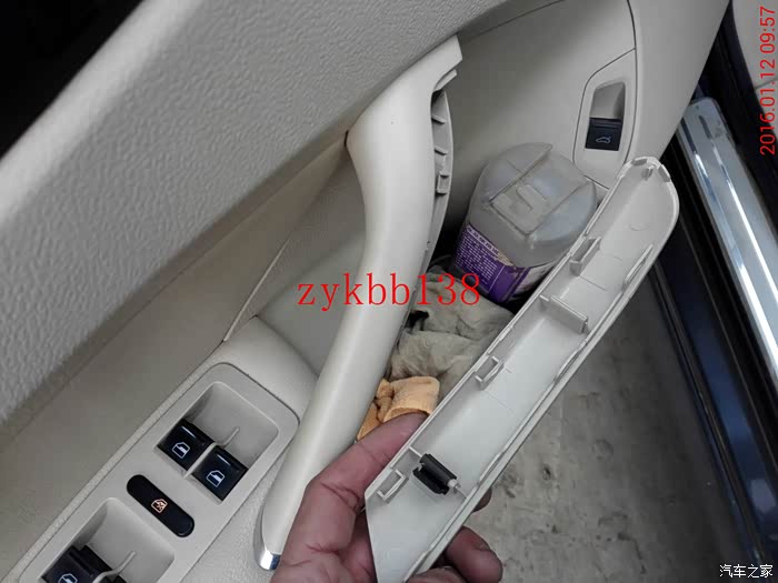 7颗卡子都撬开后,用一只手拖住车门饰板的下面开口出,另一只手捉住车门饰板的上面,下面往外掰的同时上面往上提,车门饰板就下来了:
