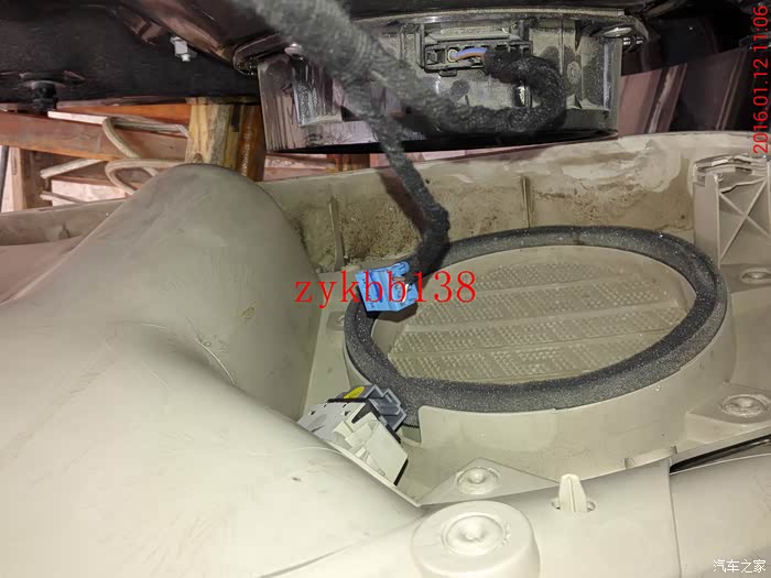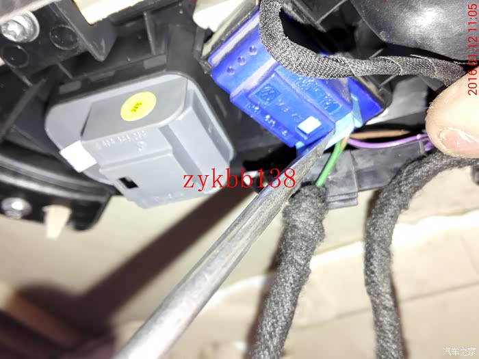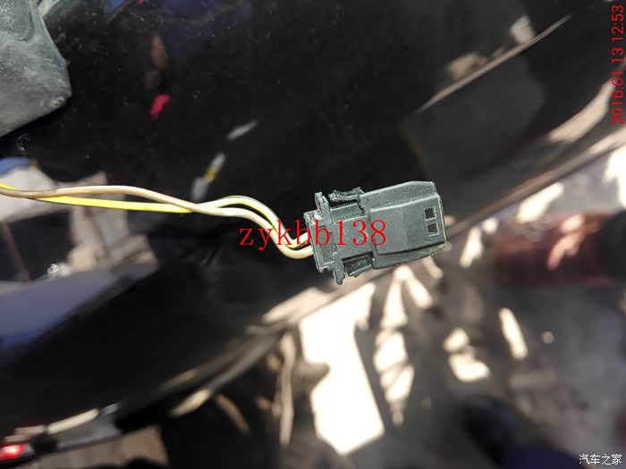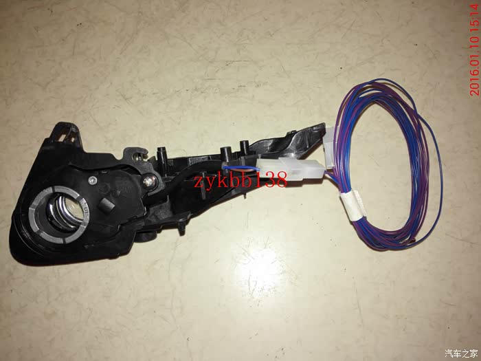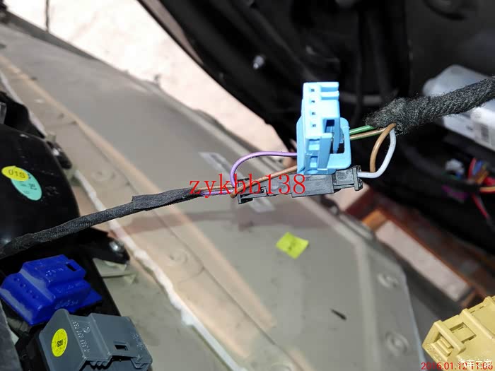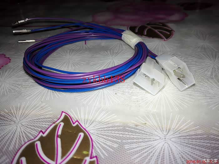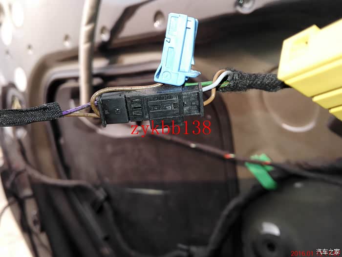 这里说下,这个蓝色的插头是车内门把手LED扣手灯的链接线,以前安装的时候没有拍照,好多车门问我怎么个接法,现在上图片,大家可以看到了。灰色线是正极,褐色线是负极。: