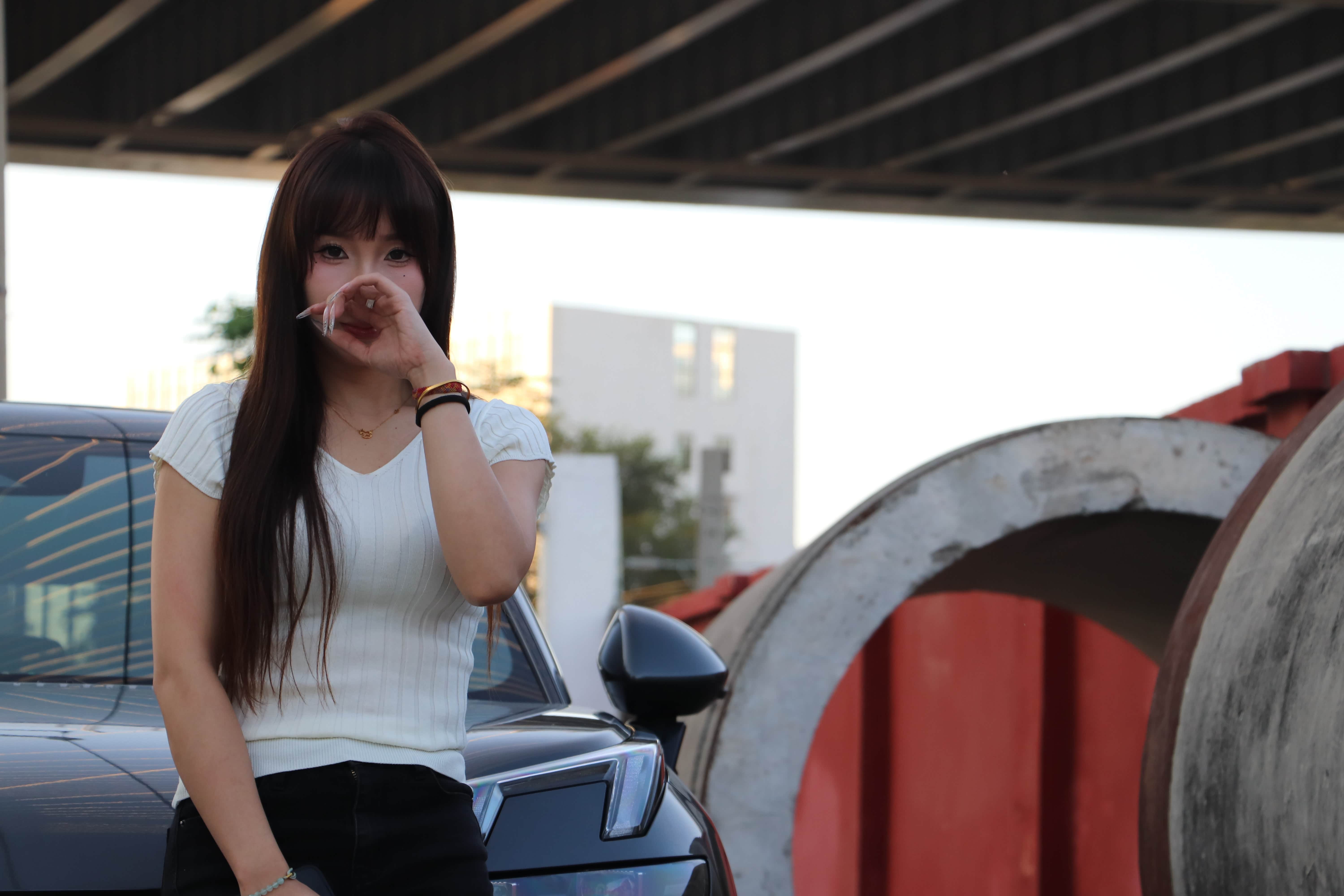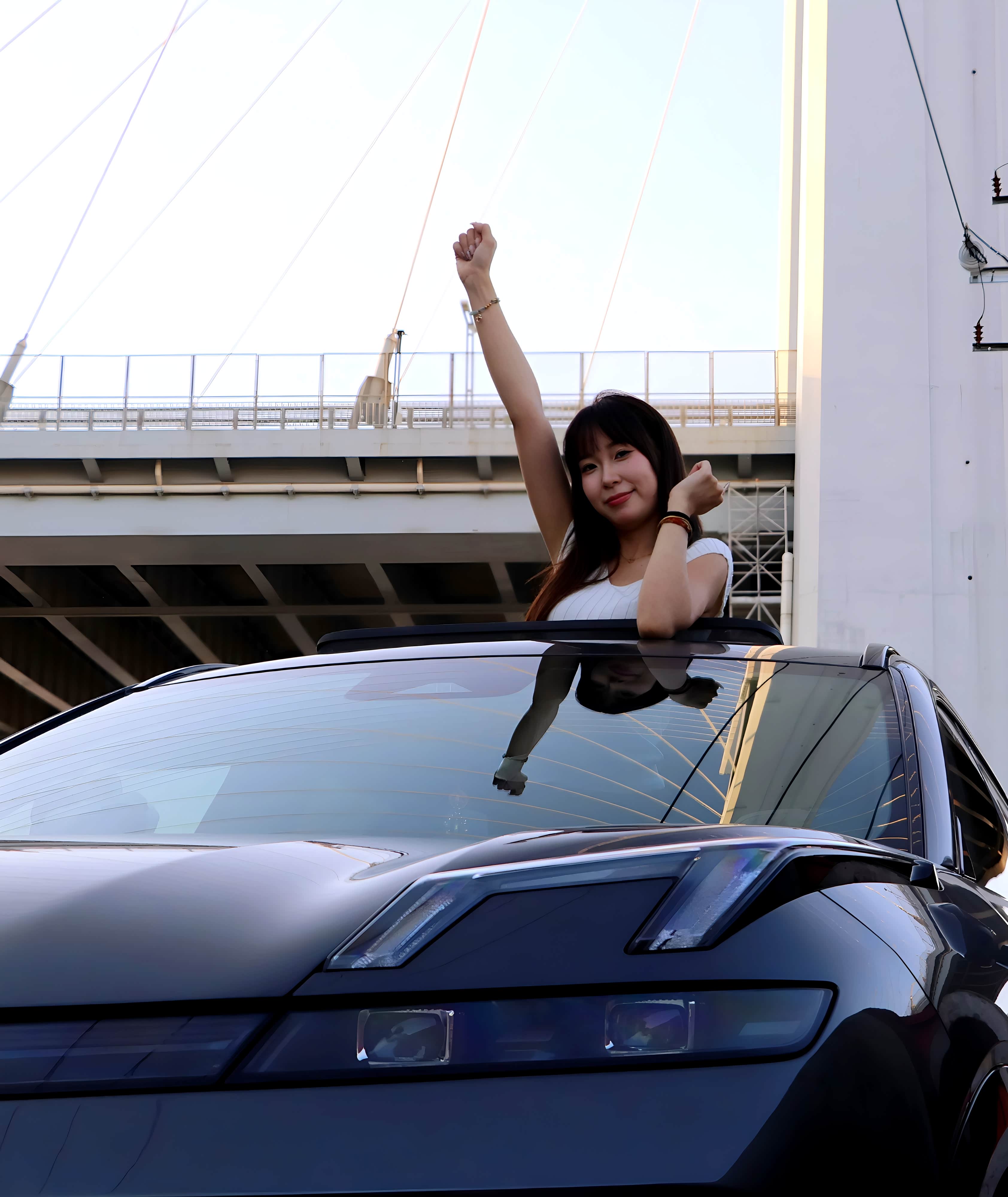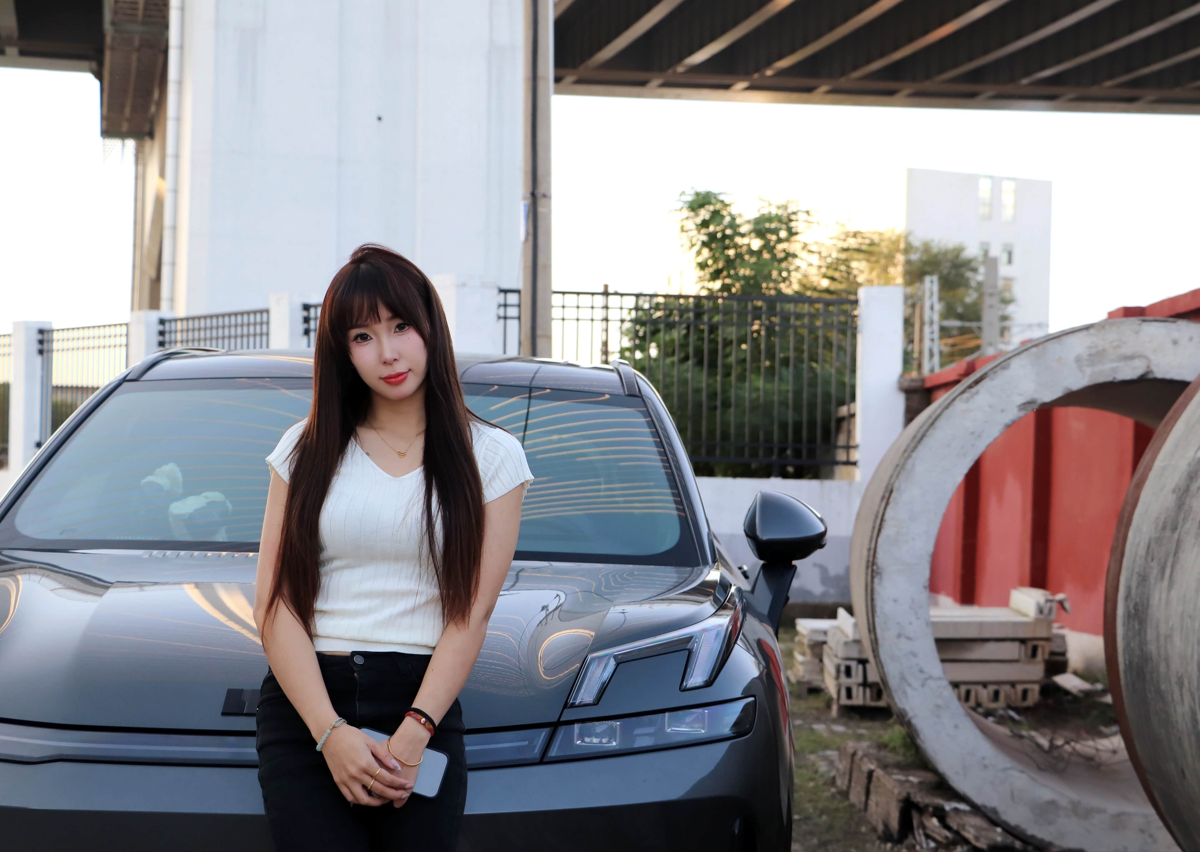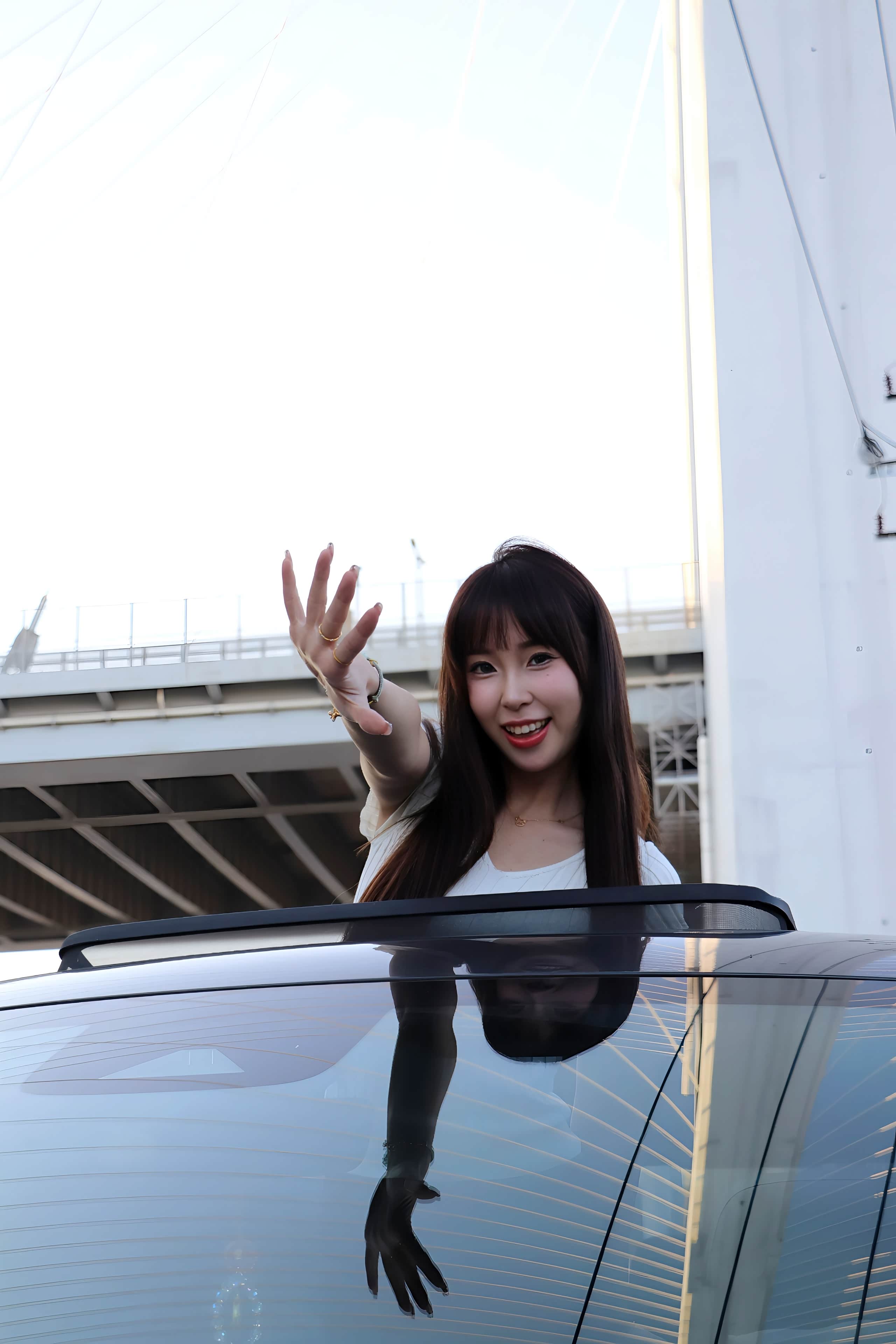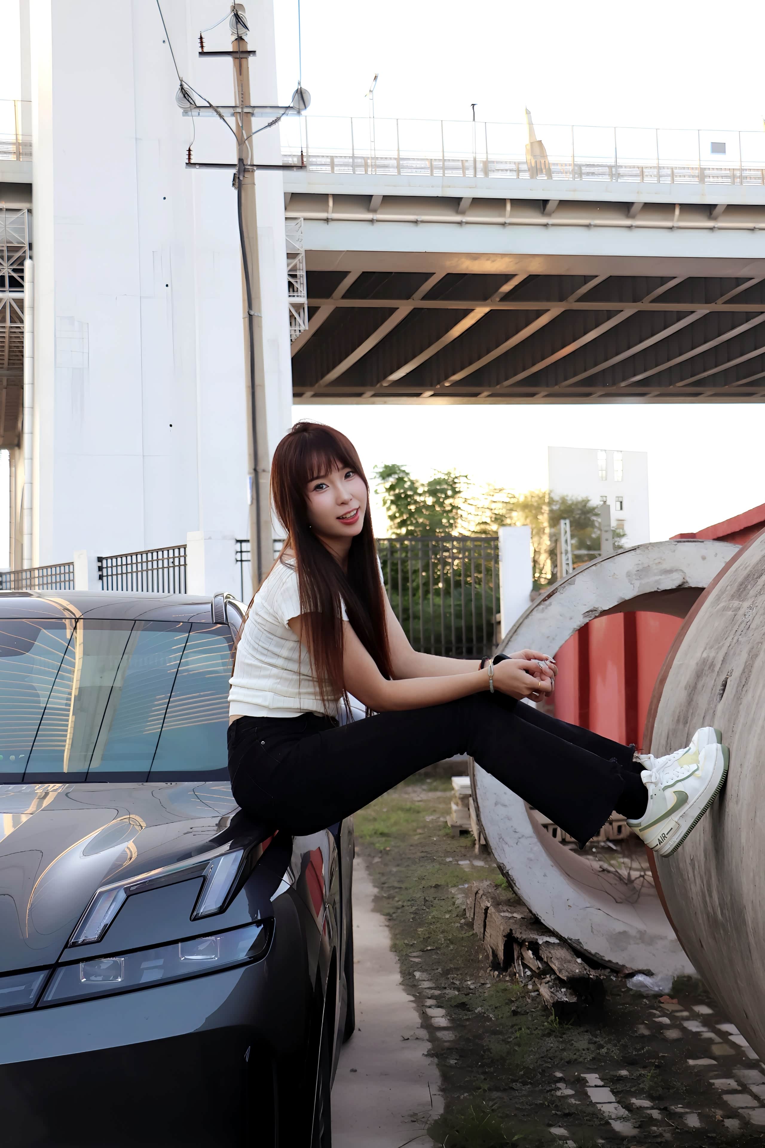 那天在桥下停车,她嫌车里待着闷,直接拉开全景天窗探出身子,胳膊举得老高摆姿势。车顶够宽够稳,她踩着引擎盖坐上去的时候,我都没担心“晃”——这空间、这质感,早把“车”活成了能移动的“小据点”,想坐想站都由着性子来。
