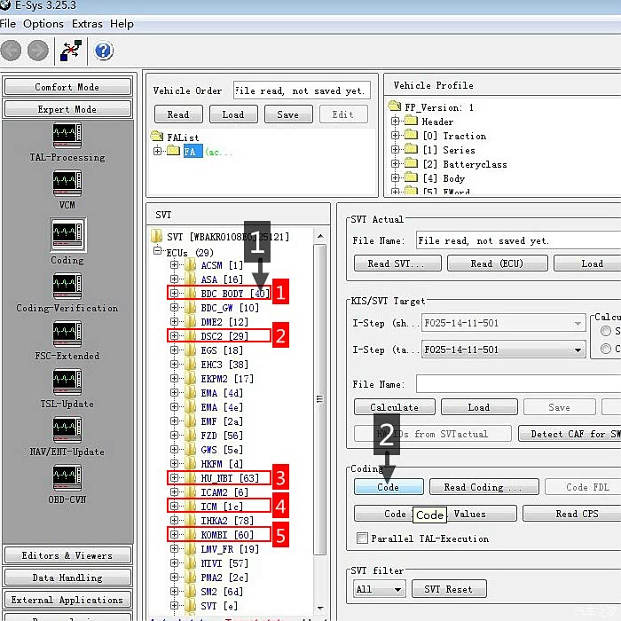 "Export mode", 1.点"Coding";2.在FA上点右键选"Activate FA";3.点"Read (ECU)"