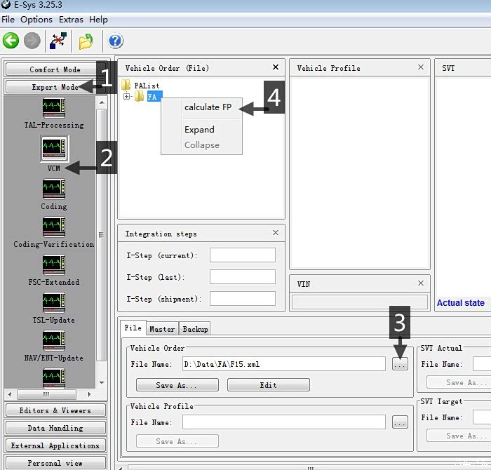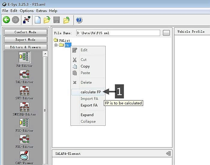 1.点"Export mode";2.点"VCM";3.选择刚刚储存的FA档案;4.在FA上点右键选"calculate FP"