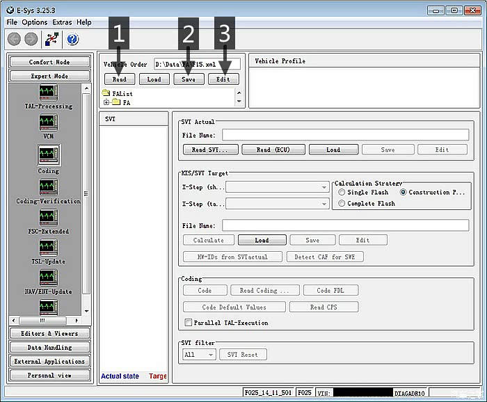 开启E-Sys连接车辆, 1.点"Read"读取FA;2.点"Save"储存FA(范例用F15命名);3.点"Edit"