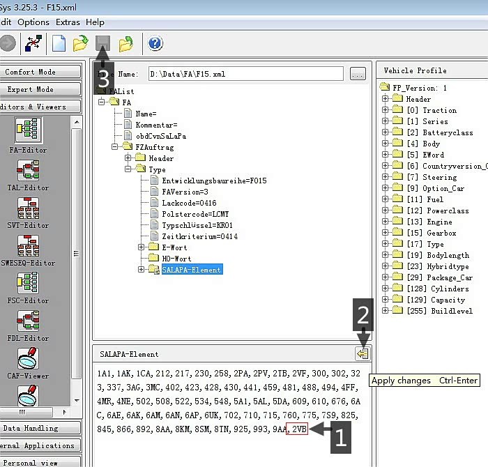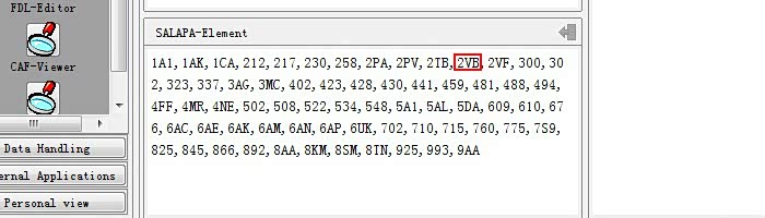 展开FA列表选取最下方"SALAPA-Element", 下方框框会出现全车的VO码清单, 点选清单最后空白处, 1.输入",2VB",记得将标点符号","加上;2.点按钮添加;3.点按钮储存