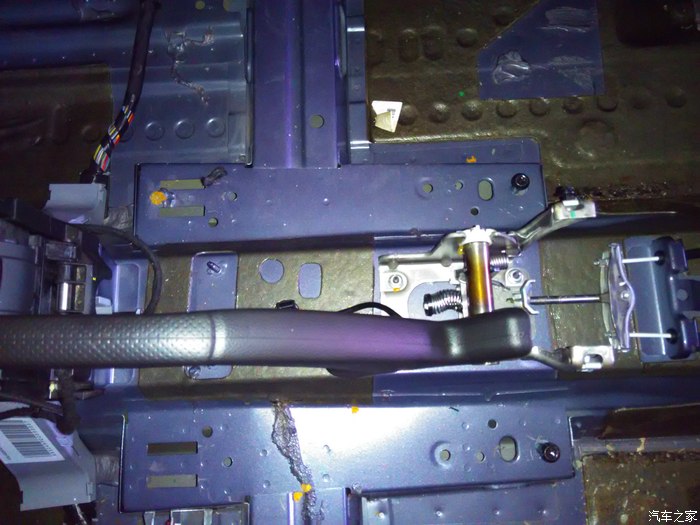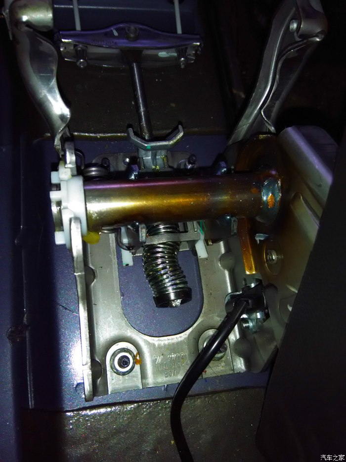 看到这个弹簧了吗?这是小科特别设置的。因为松手刹前,你需要向上先拉一下手刹,也就是如果用很大力拉上手刹后,你仍然有一定的余量拉动手刹,而不是靠零件的变形来达到松手刹的目的。这个设计还是很特别且很贴心的。