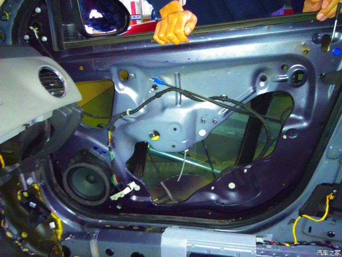 看看拆掉车门内衬的样子,里面就是一层塑料布,也就是低端车采用的防尘材料。同级别的悦动、老款POLO等里面是一层钢板。至于新POLO什么样子我没有拆过不敢妄言