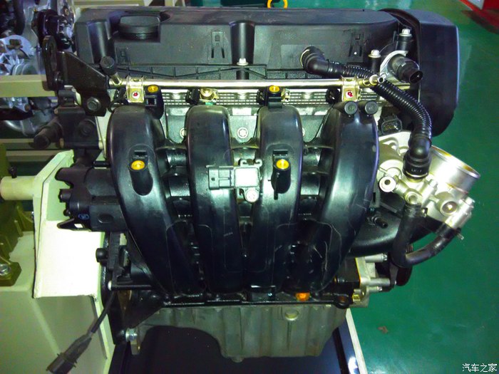 小科的进气歧管,塑料的。里面有个阀门,采用的是进气道可变长度控制以分别控制在高速和低速时发动机的充气效率,从而保证油耗。左边那个阀门就是干这个用的。如果一个人在驾驶室加油门,一个人在外面看,能明显看到他的动作