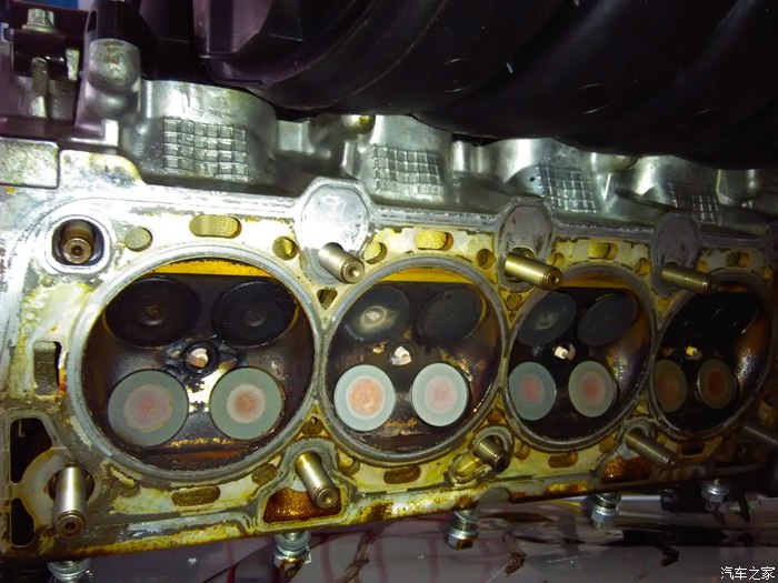 看看气门,每个汽缸四个气门,发黑的是进气门,发灰的是排气门。中间那个白点就是火花塞也成火嘴