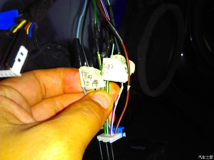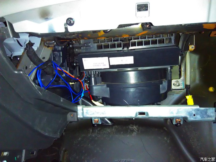 这是拆掉手套箱的样子,贴着两个标签的就是空调滤芯盖子,里面就是空调滤芯。同样蓝色和红色电线都是外接的。
