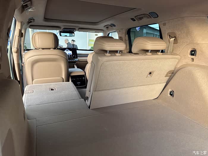 空间是另一个让我惊讶的点。五座状态下的后备厢已经大得夸张,官方数据是828L。但这只是基础玩法。更绝的是,它的后排座椅可以完全放平,形成一个超过2米长的巨大纯平空间,容积拓展到 2112L。销售直接演示了“五座变三床”的模式,两个成年人在里面躺下完全没问题。这对于深度露营爱好者或者喜欢在车上小憩的人来说,吸引力是致命的。这不再只是一个装载工具,而是一个可移动的休息基地。
