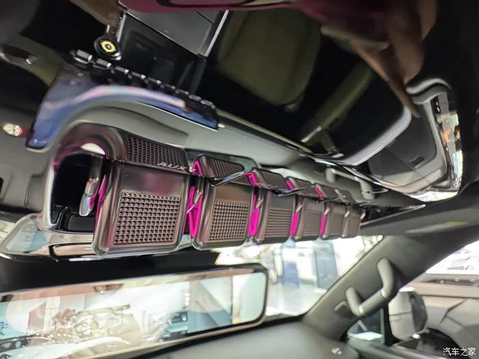 金属脉冲按键是内饰的点睛之笔。发光金属按键手感沉稳有力,按下时氛围灯同步呈现呼吸式光效,立体几何花纹在夜间如星辉点缀,硬核中透着高端奢华。仪表台功能键与顶棚“飞行拨杆”形成联动,6个AUX顶置开关预留电源接口,为个性化改装玩家埋下伏笔。