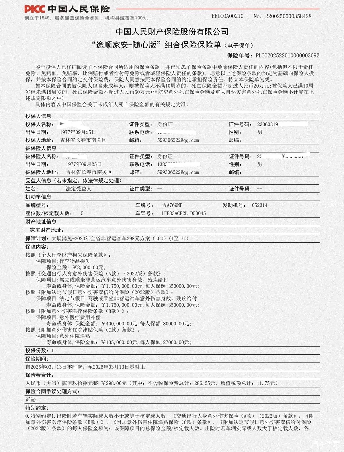 人保上车险还必须有这么一个附加险种,保费合计298元。