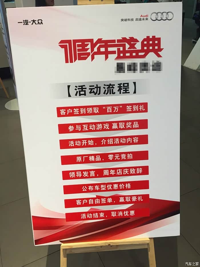 当天,风和日丽、阳光明媚。。。。。。。只持续了一小会,之家很贴心的给发了雨伞,虽然雨很大但是心里暖暖的,毕竟第一次参加之家的活动(在这里,小小的抗议下,当时活动的地址只有白云文化广场试驾广场几个字,我打了客服,客服竟然也没有详细地址,我从番禺赶过来,在那转了好久,还好是找到了,其实就在路边,一直路过了还几次没有发现)。签到之后,直奔奔驰展区,C200标轴裸车28.7万,优惠还是蛮大的,但是没有现车,提车最快3个月,这就纠结了,夫人挺着肚子呢,跟销售说了,再考虑考虑,然后我就转啊,转啊。虽然一会雨一会晴,但是人山人海。到了宝马展区,3系标轴优惠力度也很大,但是同样是至少3个月提车。然后就到了奥迪展区,我装作不经意的样子路过了一辆A4L自动舒适版,开门坐了进去,销售开门见山,说先生您要是看A4L我们店今天店庆,一台个性运动版现车特价,最快1周提车,晚上还有活动抽奖神马的。因为之前较为深入的了解过这款车的配置,性价比是卖点,动力同级别同价位较为强劲,还是quattro全时四驱,双离合变速箱,空间还算比较宽敞,关键是我一听价格当时就心动了,但是怕是展车或者是库存很久的车,所以犹豫了,销售说如果参加活动的话得先交2万定金,我真心想去看看,打电话跟媳妇商量了一下,再三斡旋,同意先交2千诚意金,如果看了现车不满意再退还。当时心想,可能这就与我的奔驰梦say goodbye了。