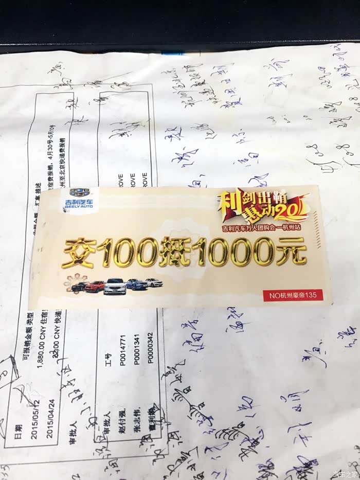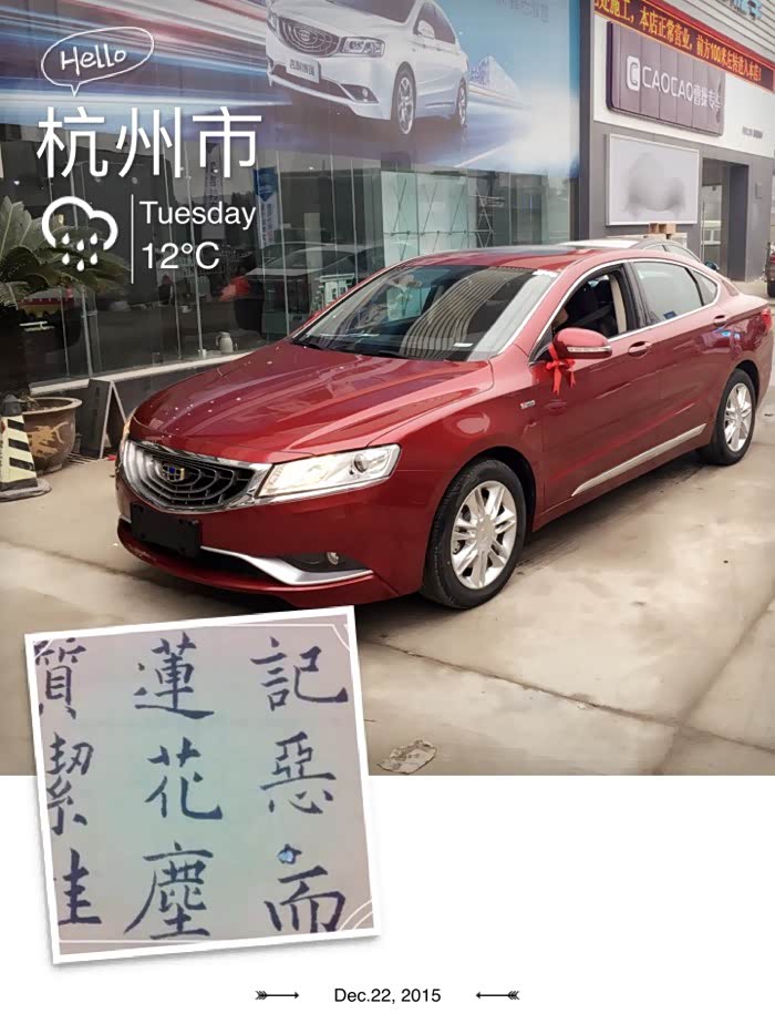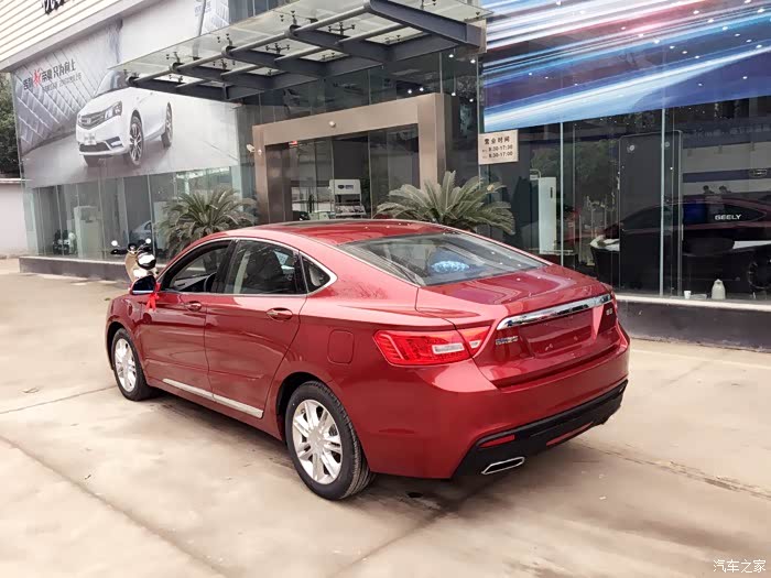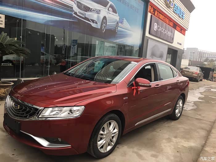 首先,能够这么快拿到车,少不了4S店销售经理陈哥(陈为国)的贡献,我是这幺称呼他的,在此感謝!本人买的是1.8T豪华版。我是11月14日第一次去的4S店(莫干山路1415号),进大门就看到了高端大气上档次的朱砂红,深深吸引,它便是吉利博瑞,不多说,上图为证,哈哈!