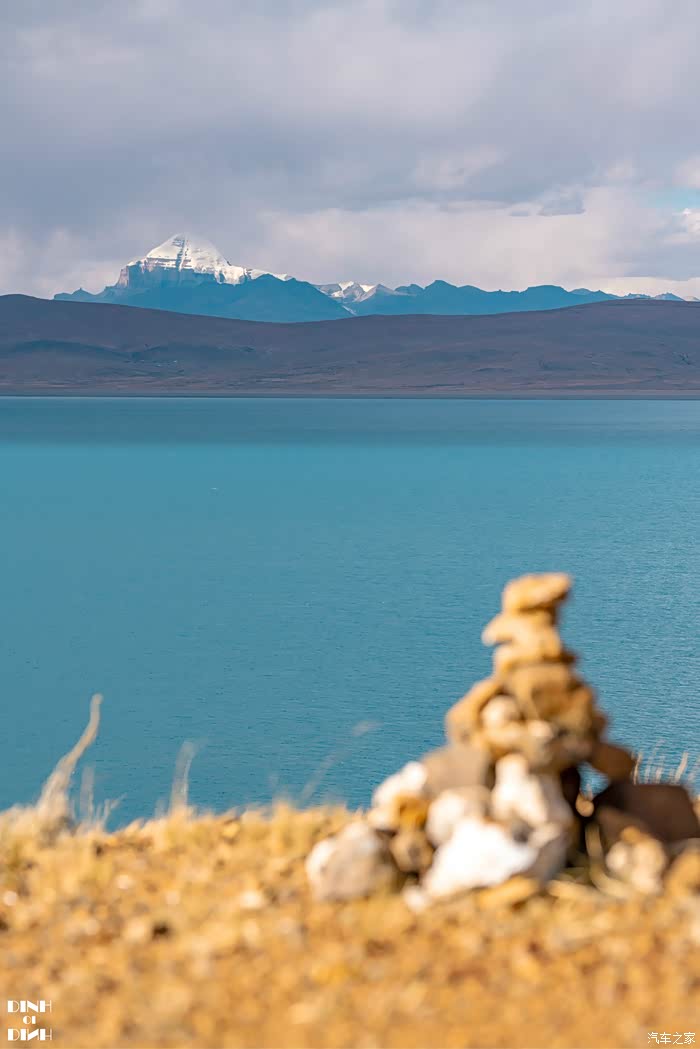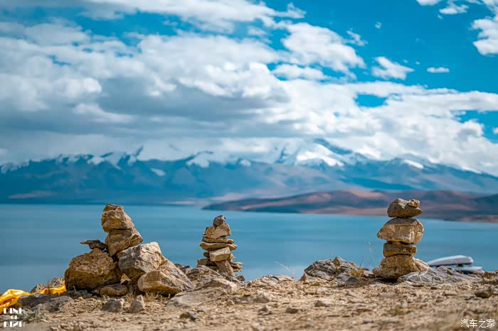 烟尘滚滚的开了有十分钟,在我们都以为我们要开到湖里的时候,张哥在一个悬崖边停了,湖对面就是雪山,我们处在一个高地,居高临下的看着脚下的玛旁雍错,远处是云深不知处的雪山,这样一幅画面美得难以形容。岸边的玛尼堆也不少,这里人很多,可下车急忙拍了照片后就马上走了,虽然人多,但是一波又一波的走了好多,而我们是最坚持的一车。拍完照恨不得拿个椅子在湖边坐一下午呢。