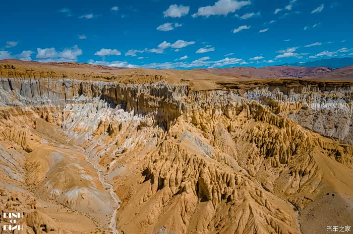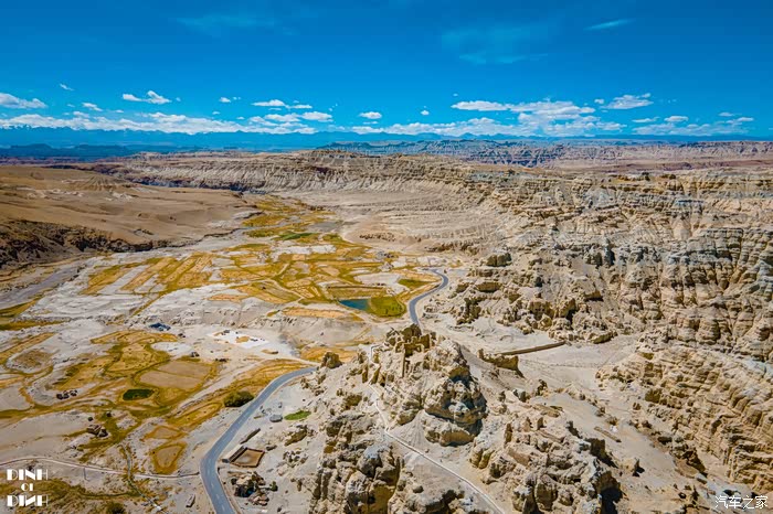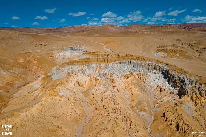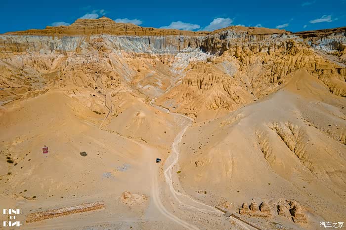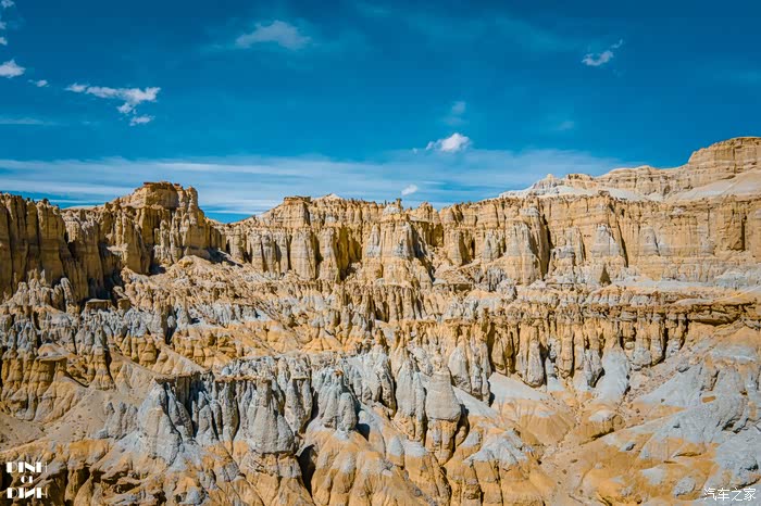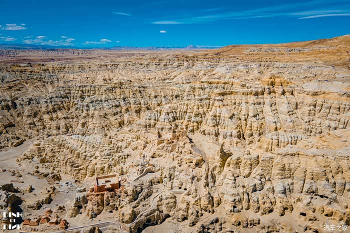 在空中俯瞰,穹窿银城就隐藏在土林里,那一个个小小的石窟就是当时的古象雄人留下的遗迹。有人说山崖上白色的土林就像一个展翅的大鹏,而“穹窿银城”这个词是汉藏合璧,藏语该叫“穹窿威卡尔”。“穹窿”是有大鹏鸟的地方之意,“威卡尔”的意思是银色的城堡。