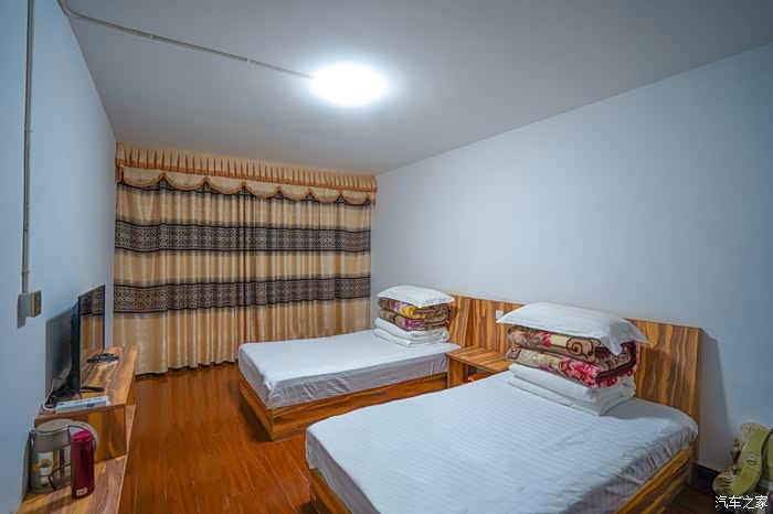 仁多昌都招待所很藏式的一个房间,晚上8点断电,然后早上8点来电,大家的电器充电都得排队,也没有自来水,是送来的“桶装水”,提供暖水瓶热水,没有洗漱间,有旱厕。因为去得早,可以选房间,我们选了一间最好的床位房。