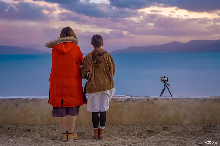 记得那一天的朋友圈我就发了这一张图,夕阳点点,人点缀了湖,湖成就了人。这应该是在羊湖最美的时刻了。