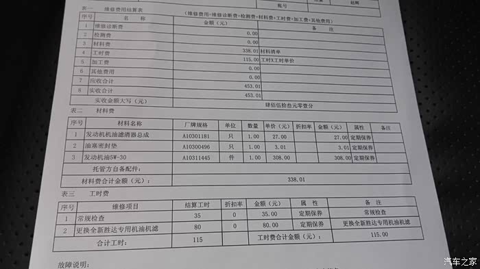 总保养费用453元,用四S点给的100低佣金和机滤低佣金最后收326.