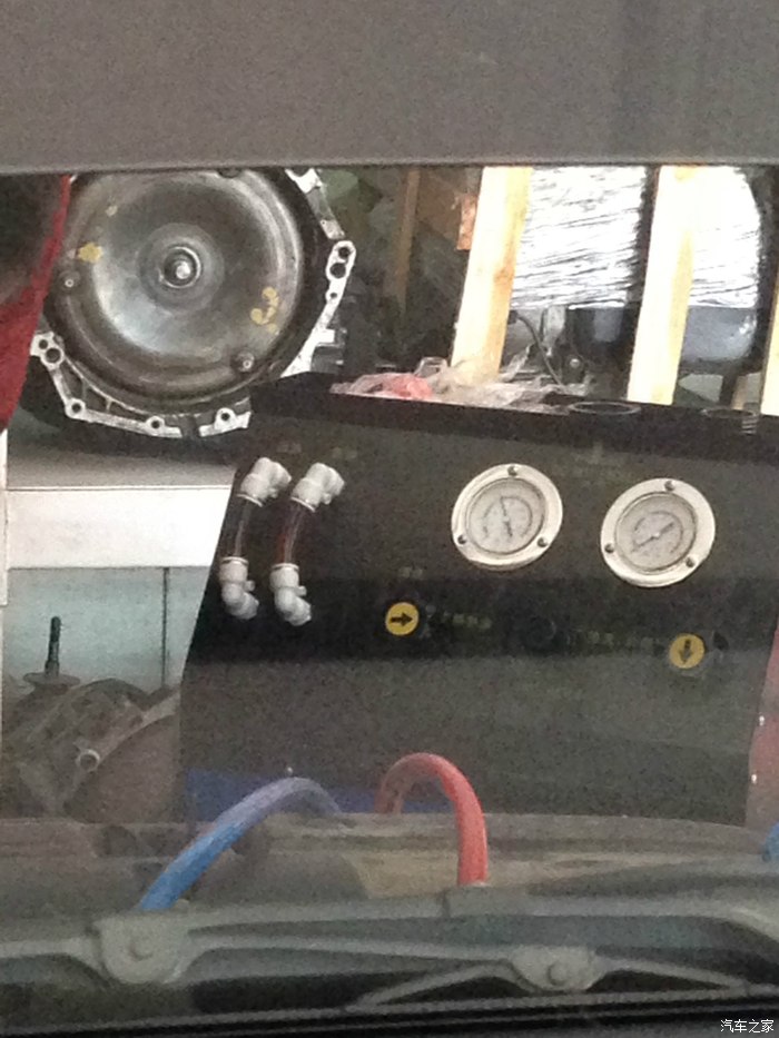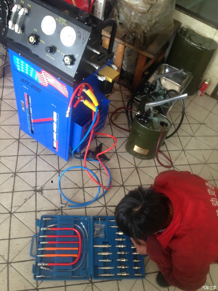 结束题外话,我带着变速箱油,去配件商拿了变速箱滤芯150一个,然后找到一个专修自动变速箱的修理店,用循环机彻底换油。老板看了油先说“你这可不是专用油啊,我们只负责工时费,别的不管”。(言下之意他有专用的,这年头,自己如果不懂,真禁不住层层忽悠)。下面说换法。原想先通过放油孔放油,再拆掉油底壳擦油泥,然后换上新的变速箱滤芯后采取循环法用新油把旧油顶出来。做到95%以上的换油率。但实际情况并不乐观,这款变速箱油底壳在前面,不在底面,况且老板说拆掉油底壳也见不到滤芯,如果想换滤芯就得搭变速箱,得不偿失,没必要。老板的这个建议必须采纳,毕竟原装货没坏就拆着玩,再组装上谁知道会不会有问题,太冒险了。