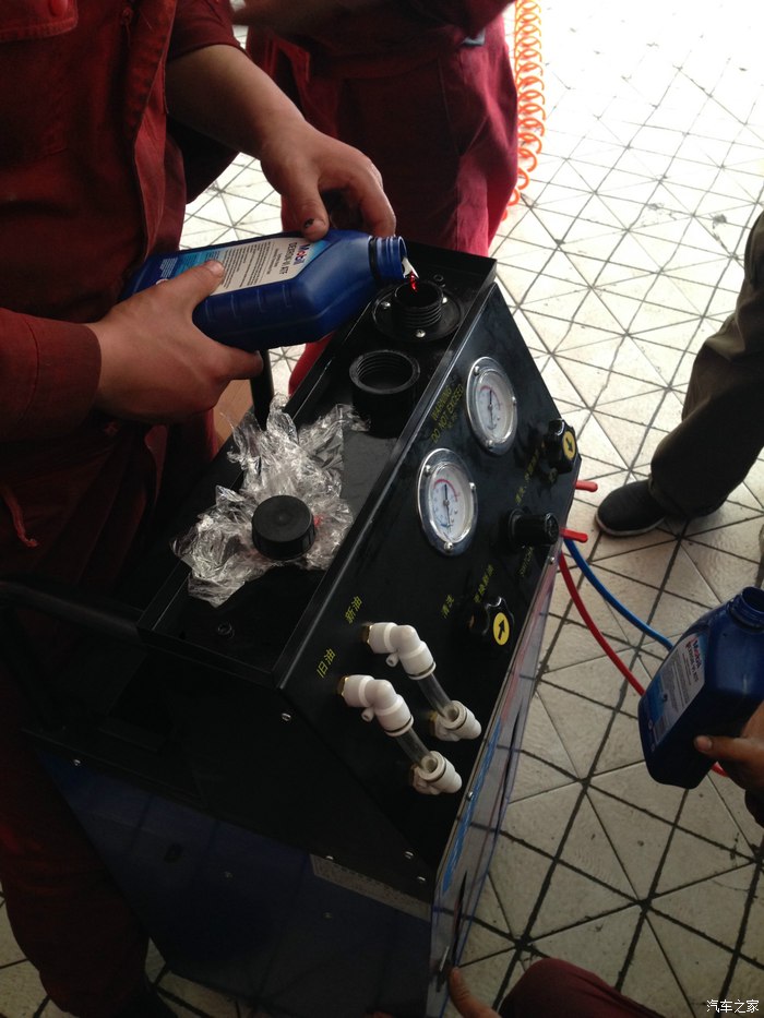 一边放油,工人一边找专用接头连接变速箱,旁边的就是循环机,我打开看里面油桶还是很新的。 防止残留的不同油液混合。
