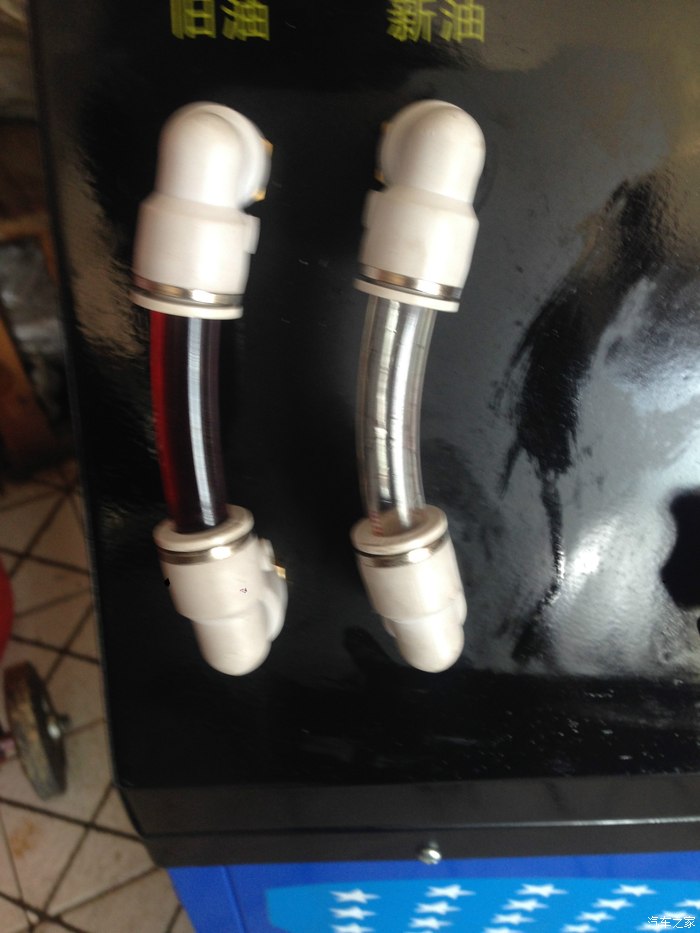 在车上我只能把手机照相放到最大才能勉强看清楚循环机上新油是红的,出来的旧油是黑的。