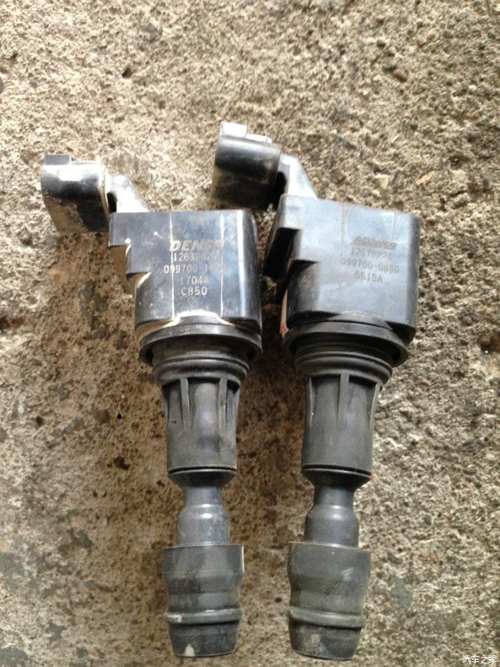 点火线圈对比:左边是原厂用的电装,右边谁知道从什么车拆下来的AC德科。一看上边的泥就知道哪个是我的。
