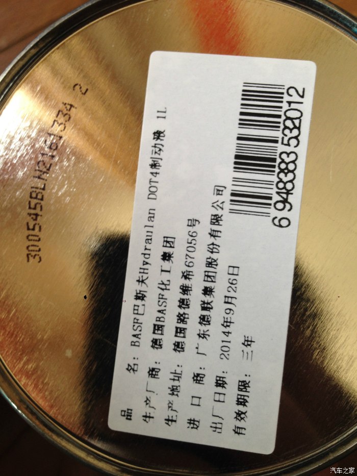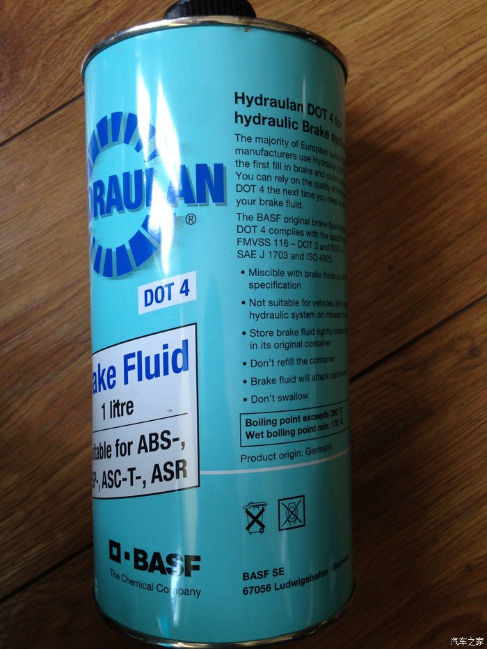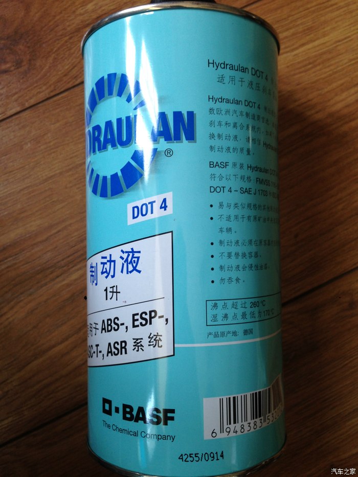 DOT4的刹车油可选择的太多了,对于50000公里更换一次来说,价格可以忽略不计。上一次换的是德国进口的“博世铁桶”,这回多花几块钱买的是同样德国进口的“巴斯夫铁桶”。其实那些只有这个一半价格的刹车油也照样使,只是买名牌的心理作用而已。