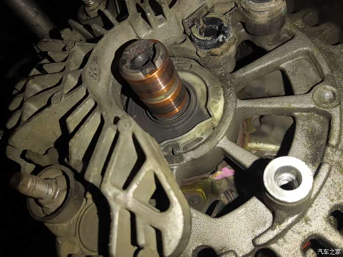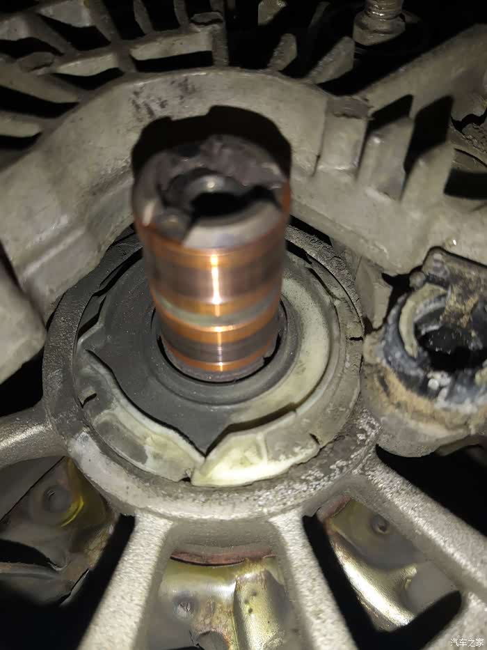 如果不用拆下来就最好了,后面空间足够,直接掀开后盖就可以更换。以前研究过发电机后盖,去掉电源线后,还剩下三根小的螺丝,当时看不清以为还有螺母,试过各种工具都套不上。今天再拿可伸缩的灯探进去仔细看,就三根光秃秃的螺杆,盖子是直接卡在螺杆上,没任何固定方式,汗!可以直接撬开后盖,试了下起子,各种方位撬不起来,再用力就直接把盖子干废了。 算了还是辛苦点把发电机整个拆下来吧。