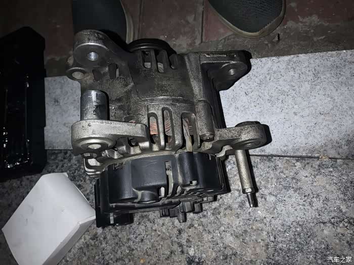 发电机是通过两根13mm的长螺杆固定在发动机身上,用小飞还是不够力,最后用了十字杆再套一个T型套筒加力。拆了两根螺丝后,发电机和拆完水泵一样纹丝不动,上下晃动也不行,没招起子上,随便一撬就下来了。发电机比水泵重多了一个手在下面还不好操作,上面管线多出不来,两个手抱金砖一样变了几次方向才钻出来。 拿出来就好办了,有的是办法拆盖子。