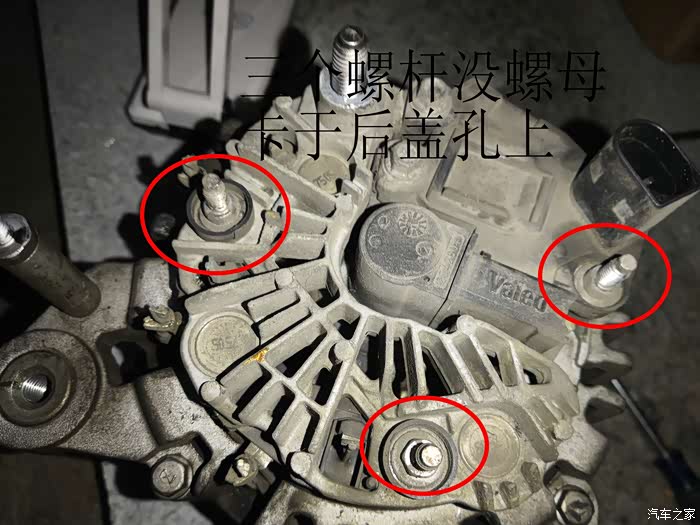 大螺杆是发电机的电源线。红圈内三根螺杆是直接卡在后盖上,没任何的固定方式,解答了网上很多车友的困惑,实践出真理。很遗憾没有单独给拆开的后盖拍一个。