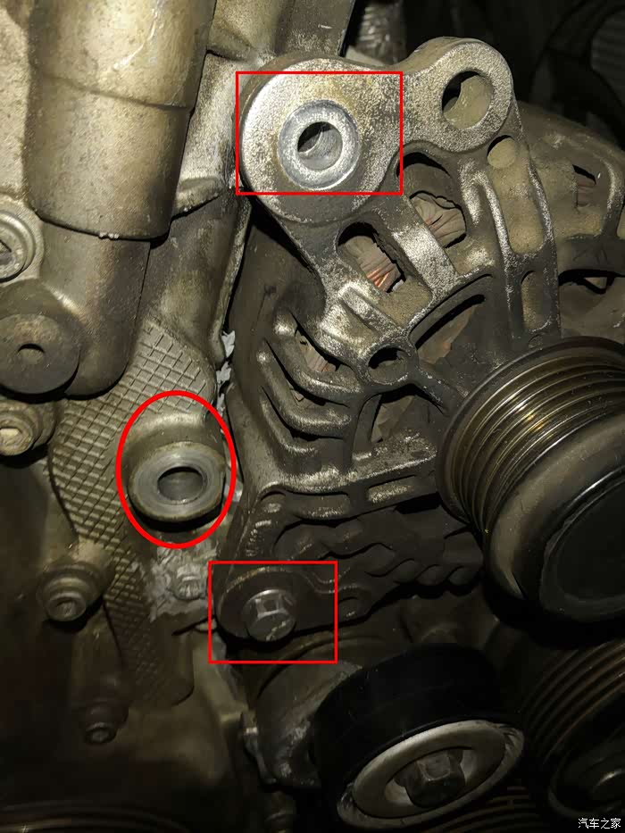 红色方框位置,发电机靠两个13mm螺丝固定。圆框为单向轮,已拆。