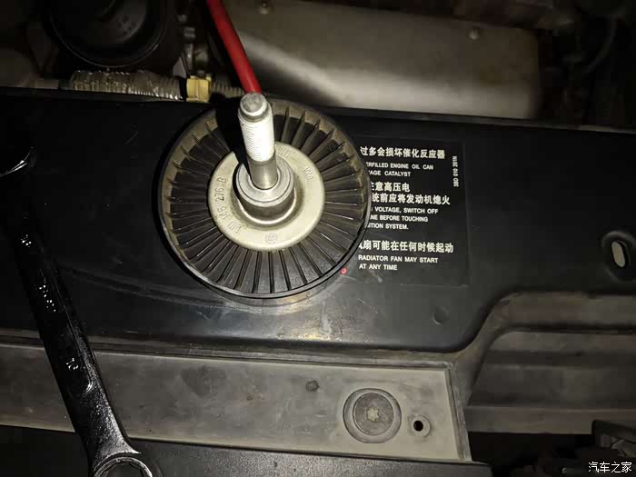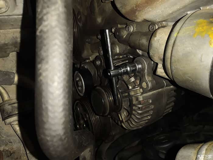 拆发电机前要拆几件东西,先拆电池上的正负极接头,后拆发电机上的电源线和线束接头和卡箍。清完各种线后,拆皮带和导向轮。拆皮带这里不详细描述,感兴趣的车友参考我发的拆水泵帖子。导向轮(有的叫惰轮,单向轮,压轮),16mm梅花扳手套上,逆时针就可以轻松取下来。