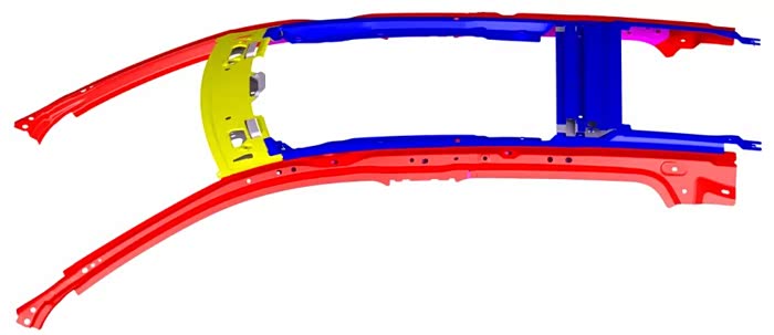 凡尔赛C5 X的天窗前、后横梁均采用了双层板大截面结构,其中加强板分别为抗拉强度520MPa、400MPa的高强钢。两侧的天窗固定框支架同样采用了抗拉强度400MPa的高强钢。两侧的侧围弧形里板更是值得称道,同样采用双层板结构,从A柱一直延伸到B柱,内外两层板分别为1150MPa的超高强钢和1600MPa的热成型钢。