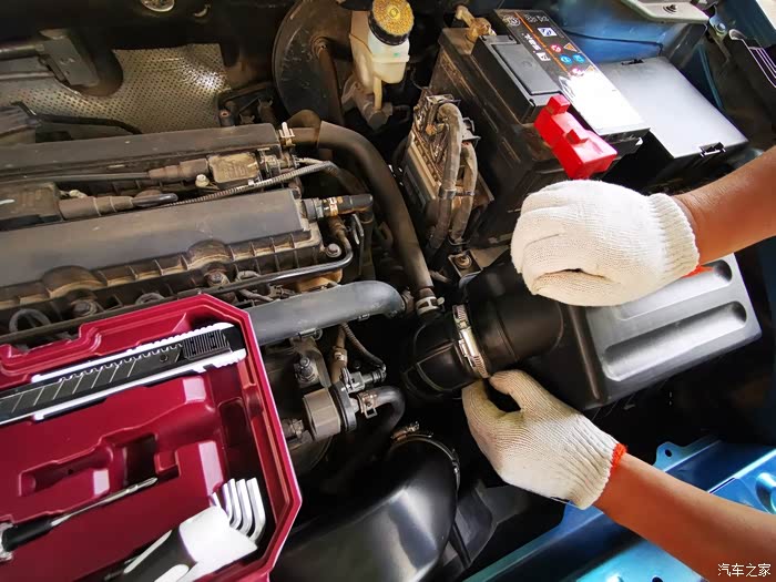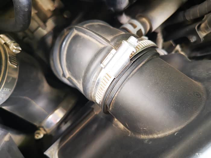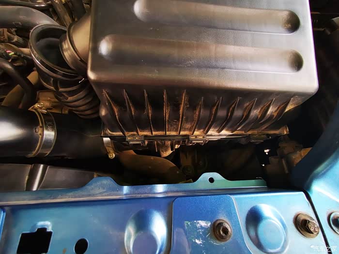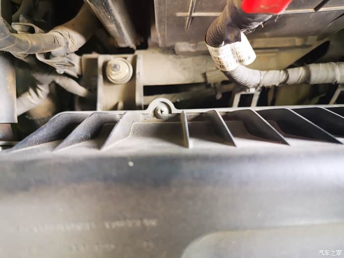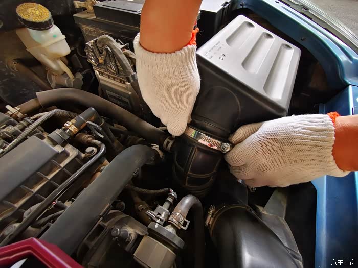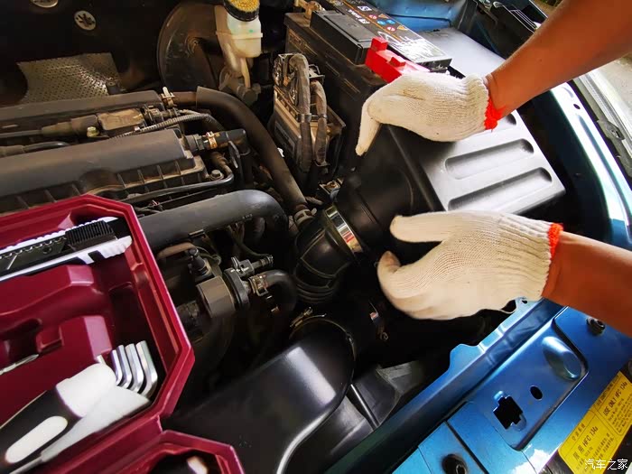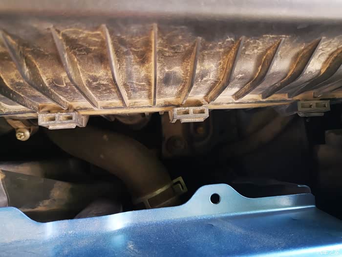 空气滤芯盒的连接软管,等会儿要把它松开,褪掉后才能把盒盖打开。