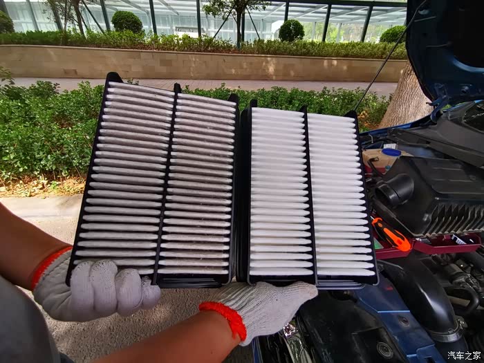 一万公里的滤芯和新滤芯的对比,磕一下灰尘很大,这个东西一般来说一些汽修店会吹下再用,其实是真吹不干净的,二三十的东西还是换掉吧!发动机进灰尘是会影响寿命的!
