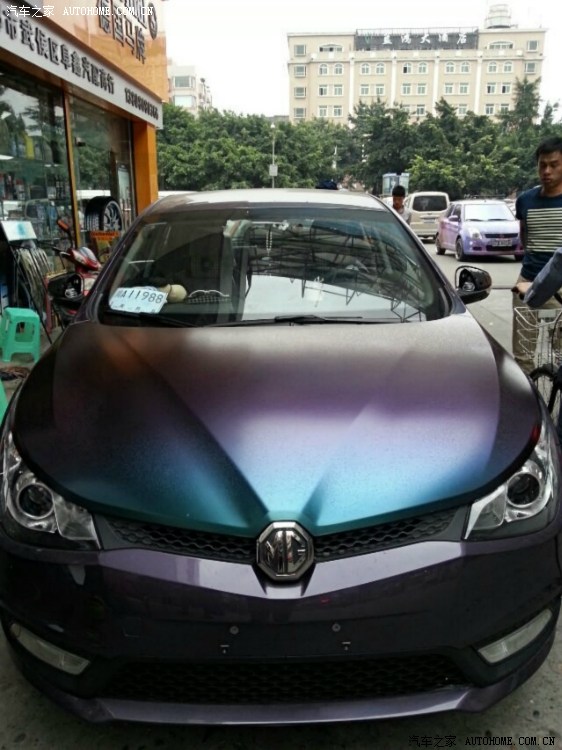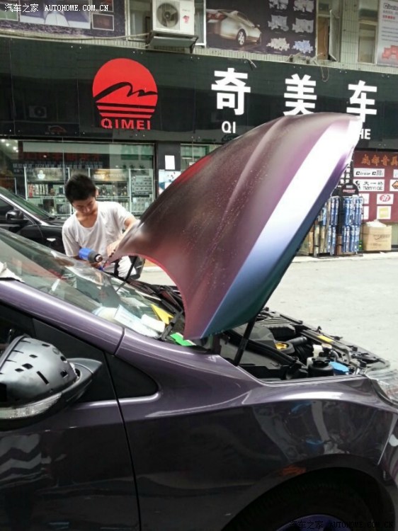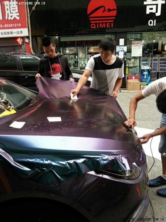 公司位于两个公园附近,生态环境那叫一个好啊。整天都有鸟粪落在车上,后面自己看不到还不觉得,前面就有点让我无法忍受。早前在其他帖子上看到了这种变色龙膜。随着光线、角度的不同,可以呈现蓝、紫、红多种颜色渐变的效果。这种和阿紫简直绝配的好东东我怎么可以轻易错过?于是,众里寻他千百度,约好时间就去了,老板人很好,轮毂也是自己买的材料在他店里喷的。几个师傅上下其手,仔仔细细的帮我的阿紫裁剪新衣。