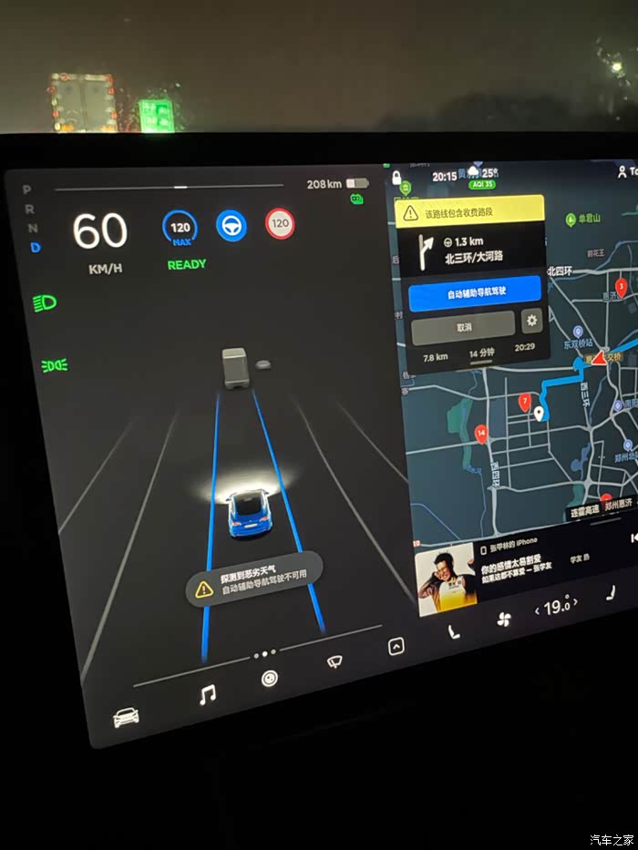 这是19号的晚上,当时回家在高速上已经下雨非常非常大了,比较值得夸赞的是在人眼都很难看清楚的道路,辅助驾驶竟然完全没有退出的意思,非常稳的在帮我开着。。