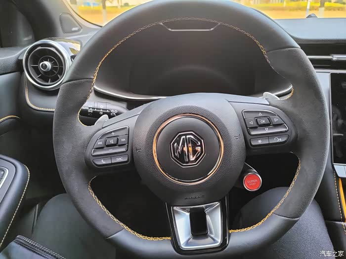 原厂的翻毛皮方向盘,后期也不用改了,不过可以加个红色加长的拨片。