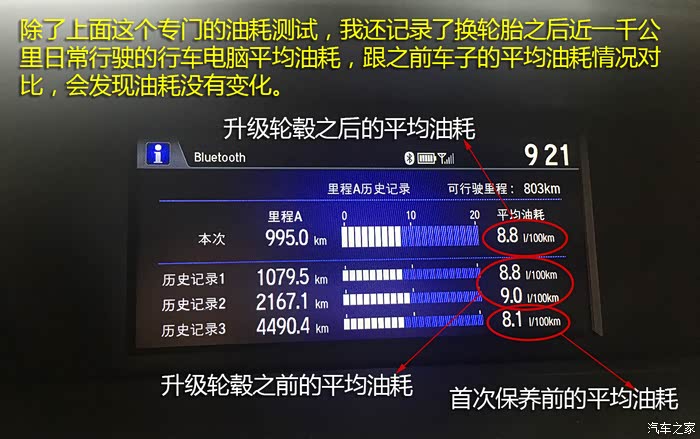 3,油耗跟原厂轮胎基本一致,事实上随着车子越走越多,油耗呈下降趋势,现在平均油耗大概是8.5升。