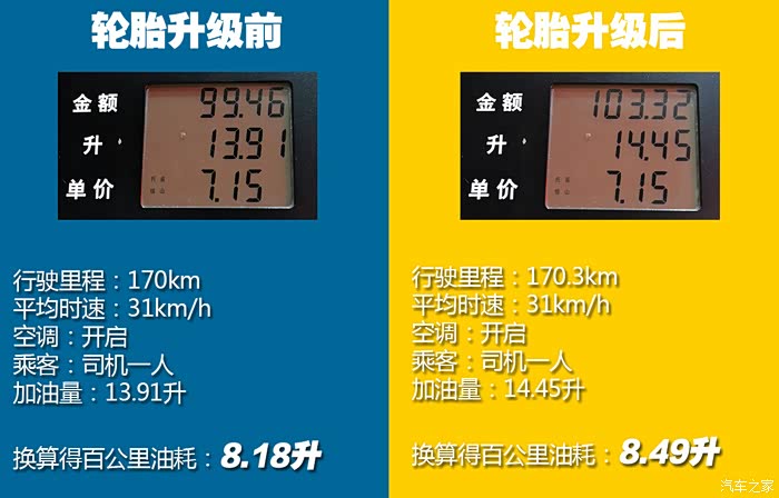结果升级轮胎后的雅阁加油14.45升,换算得百公里油耗是8.49升;原装轮胎的雅阁加油13.91升,换算得百公里油耗是8.18升,也就是说在这个油耗测试里面,升级之后雅阁百公里油耗仅仅增加了0.31升,完全在我可以接受的范围内。