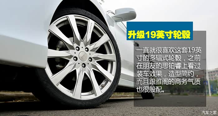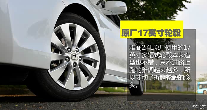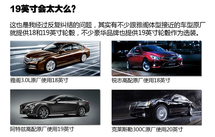 换什么轮毂好呢?其实我早就心有所属,是一套19英寸的多辐式轮毂,造型简约,而且跟雅阁的商务气质很般配。会不会大了一点?这也是我经过反复纠结的问题,目前2.4L雅阁原厂使用的是17英寸轮毂,3.0L雅阁原厂使用18英寸,丰田锐志高配的车型也是原厂使用18英寸,马自达阿特兹高配车型原厂使用19英寸,进口的克莱斯勒300C原厂使用20英寸,奔驰、宝马、奥迪、捷豹也给部分车型也提供19英寸轮毂作为选装。从视觉效果出发,以雅阁的体型用19英寸轮毂并不夸张。