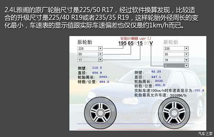 首先要确定的是轮胎尺寸,一般来说工程师们建议轮胎升级之后外径周长变化应在+1.6%~-2%之间,以保证车速表的显示准确。网上有不少轮胎尺寸升级计算软件,可以直接显示轮胎周长以及车速表数值的变化情况。