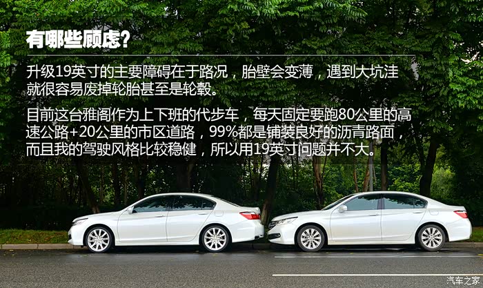 主要的障碍在于路况,选择19英寸轮毂意味着轮胎扁平率会更低,遇到大坑洼就很容易废掉轮胎甚至是轮毂。目前这台雅阁作为上下班的代步车,每天固定要跑80公里的高速公路+20公里的市区道路,99%都是铺装良好的沥青路面,而且我的驾驶风格比较稳健,所以用19英寸问题并不大。当然,大家担心的还有动力和油耗,放心,这就是我接下来想通过实测来给大家解答的问题。