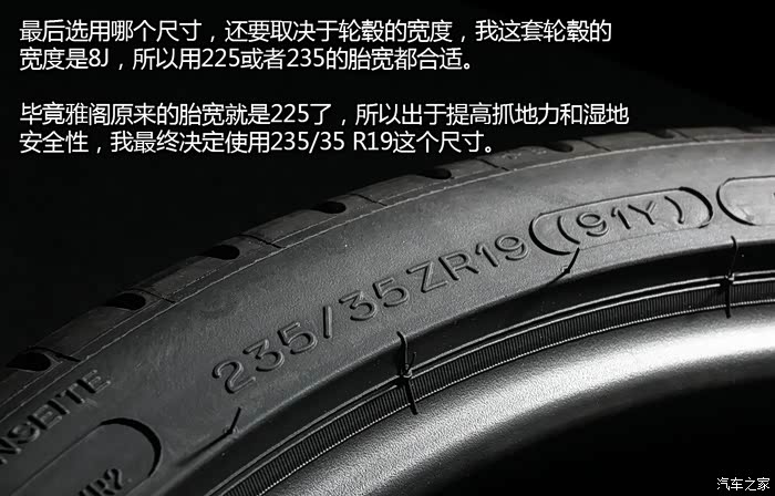 估计大家也猜到235/35 R19这个尺寸属于比较“运动”的一类,所以可选花纹不多,也只能在各大轮胎品牌里面的运动系列中去寻找。经过一段时间的官网钻研和各大论坛口碑调查之后,再综合考虑静音和耐用性等等细节,最终决定选用米其林著名的超高性能跑胎Pilot Super Sport。价格不菲,但根据笔者多年的试驾经验,轮胎抓地力直接影响车辆的主动安全性,包括制动距离以及循迹性等等都很大程度取决于轮胎,再先进的四驱系统(假如有)或者电子系统都好,最终还是要通过抓地力实现的,所以轮胎必须要选好的。