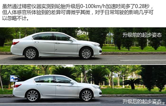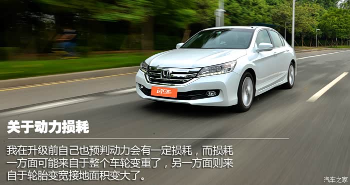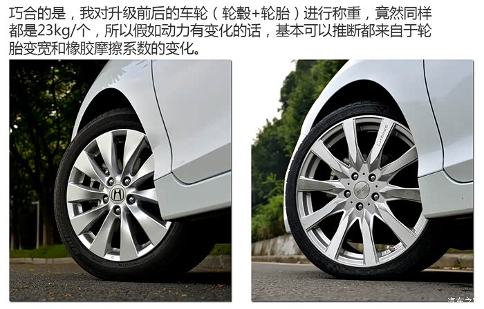 巧合的是,我对升级前后的车轮(轮毂+轮胎)进行称重,竟然同样都是23kg/个,所以假如动力有变化的话,基本可以推断都来自于轮胎变宽和橡胶摩擦系数的变化。换轮胎后到现在雅阁跑了近一千公里,从主观感受来说动力损耗非常轻微,不是车主的话基本察觉不到,假如再刻意观察的话,会在松开油门滑行时感受到车子的滚动阻力略微增加。仅此而已,对日常的驾驶完全没有影响,也没有想象中的车子“变肉”。