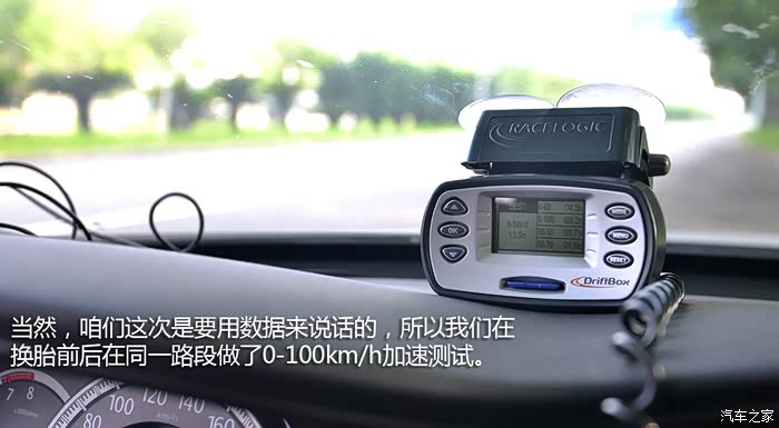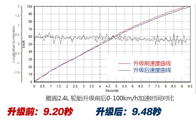 当然,咱们这次是要用数据来说话的,所以我们在换胎前后在同一路段做了0-100km/h加速测试,原厂轮胎的加速时间是9.20秒,升级轮胎后的加速时间是9.48秒,相差0.28秒。这说明了因为轮胎变宽以及橡胶材质变化,动力的确有损耗,但非常轻微。