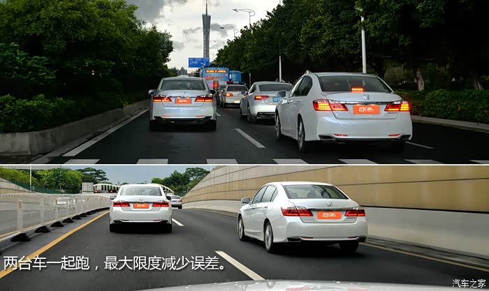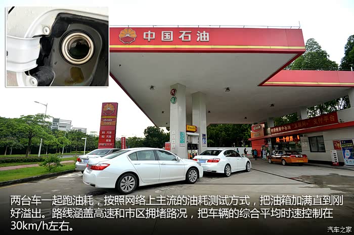 为了进行油耗对比测试,我找来了朋友的另一台雅阁,车型一模一样都是2.4L豪华版,然后购车时间和行驶里程都很接近。两台车一起跑油耗,按照网络上主流的油耗测试方式,涵盖高速和市区拥堵路况,把车辆的综合平均时速控制在30km/h左右(据调研绝大部分城市车辆的日常平均行驶速度就是30km/h),一共跑了170公里。