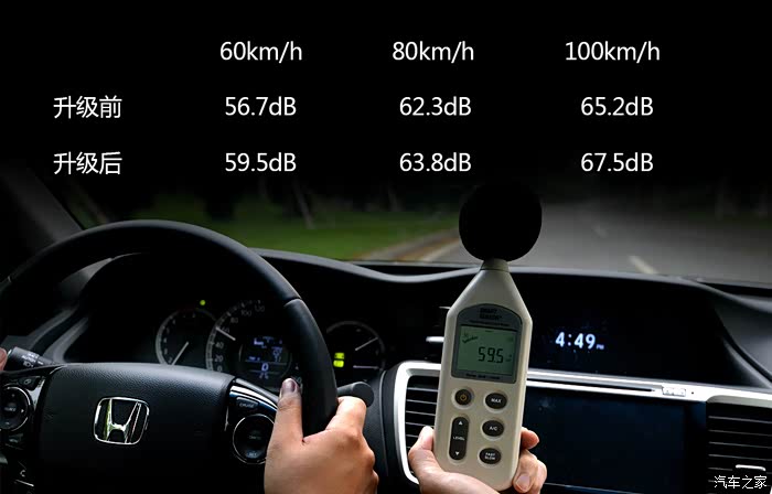 我的主观感受是换轮胎之后高速胎噪略有增加,中低速甚至比原来还要安静。还是用实测数据说话,我选用了同一沥青路段进行车内噪音测试(综合风噪和胎噪),分别记录60km/h、80km/h和100km/h时的车内噪音表现。从数据来看的确噪音值都有增加,但基本都是增加2分贝左右,也是可以接受的。