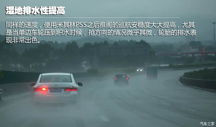 另一个主动安全提升的地方是雨天湿地行驶,同样的速度,使用米其林PSS之后雅阁的巡航安稳度大大提高,尤其是当单边车轮压到积水时候,抢方向的情况微乎其微,轮胎的排水表现非常出色。