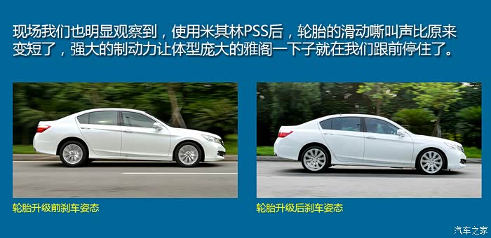 现场我们也明显观察到,使用米其林PSS后,轮胎的滑动嘶叫声比原来变短了,强大的制动力让体型庞大的雅阁一下子就在我们跟前停住了。通过这次测试我们也验证了,一套好的轮胎会直接改善制动距离,因为就算升级更强的制动系统也好,最终停住车子的制动力还是取决于轮胎的摩擦极限。